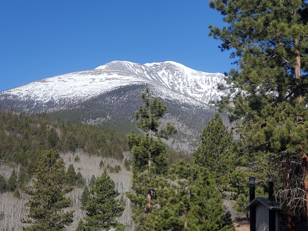 Buzz has wanted to “boondock” since we first started talking about buying a camper. For the uninformed, boondocking is camping “off the grid” …no power, no water, many times no formal camping sites at all….just out there. So on the first  part of the way home, we looked for state forests and the like.  We landed at O’Haver Lake in the San Isabele National  Forest. It is so beautiful and serene with Mt Ouray (13,961 ft) as the backdrop.