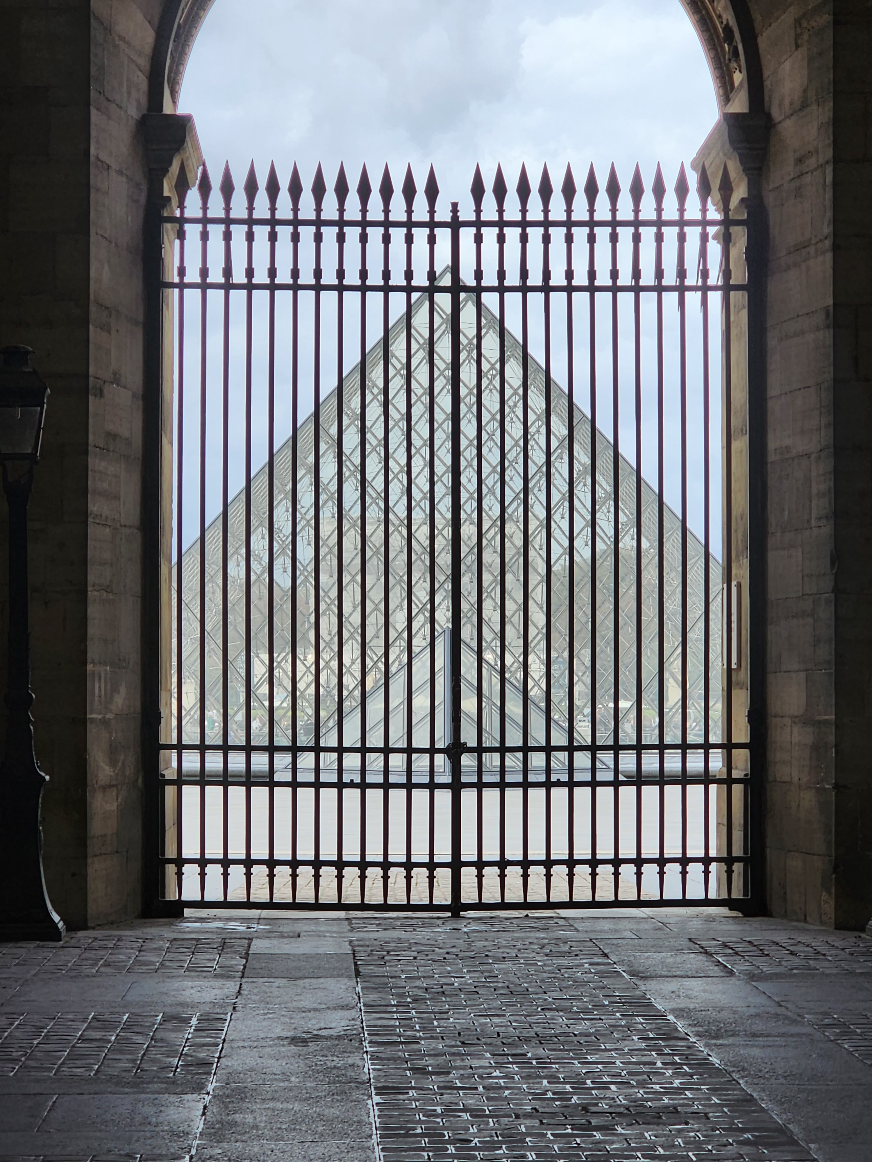 Our last stop on the tour was the Louvre. We were standing outside in the huge plaza and were heading toward the Pyramids. We had just gotten a glimpse of them when a line of soldiers asked us politely to move on. The gates between the plaza and the pyramids had been closed. The pyramids are the main entrance. We found out later that there was a bomb threat called into the Louvre and also Versailles. We were not scheduled to tour the Louvre at that time; we had tickets for later that afternoon. So as we stood in the plaza, I asked our guide if she loved the Pyramids or thought they were an abomination. Her answer was fascinating. President Mitterrand held a contest for100 ideas for a new entrance to the Louvre. He picked I.M. Pei’s pyramids. The French were not happy. 1. He was not French. 2. Mitterrand never showed the public what the other 99 ideas were. 3. He was not French!! Agustina explained I.M. Pei’s thinking about the Pyramids. The Louvre is a Renaissance museum. Renaissance means re-birth. I.M. Pei decided to give new life to the oldest form he could…the Pyramids.