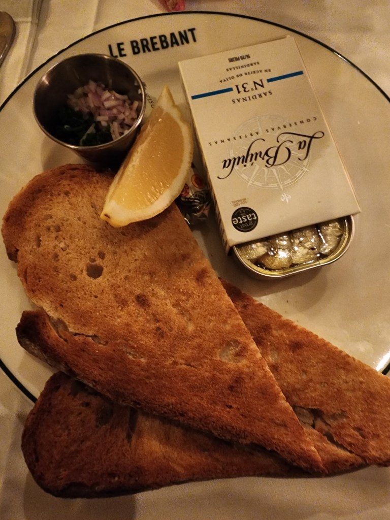 For dinner, we walked out of the hotel and wandered a bit looking for something interesting. Saturday night and everything, almost, was jam packed!! So we found a very large restaurant that was not super crowded. Turns out there was a reason for that! Buzz and I have a love for fresh sardines, especially grilled. They are so yummy. This menu had Spanish sardines and the ones we love are Greek so we went for it. Below is what we were served!!!!