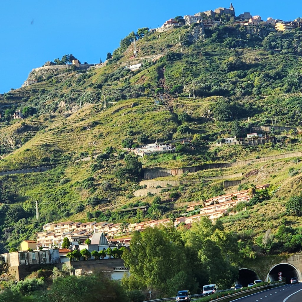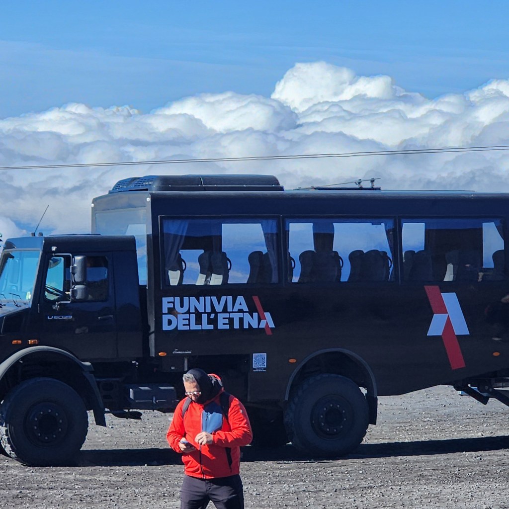 Today was the day I was most looking forward to, excepting Santorini. I was going to travel to Mt Etna, an active volcano, on the island of Sicily. We drove about about 2 hours to get to the “top” of the volcano but actually the volcano starts much lower and there are towns and people living on the habitable parts of the volcano. The bottom section of the volcano is green and lush and covers over 459 square miles. Mt. Etna is the world’s most active volcano and is almost in a constant state of activity. The most recent eruption was June, 2025.