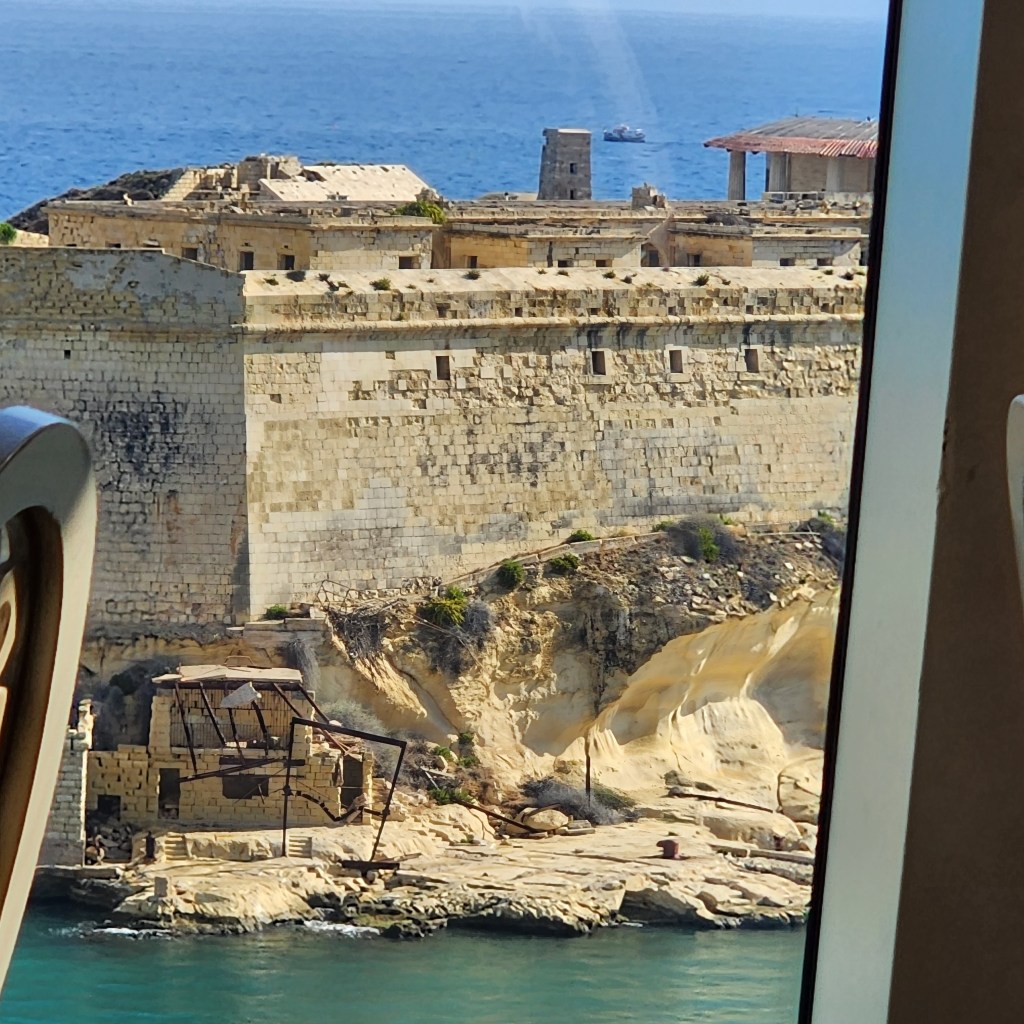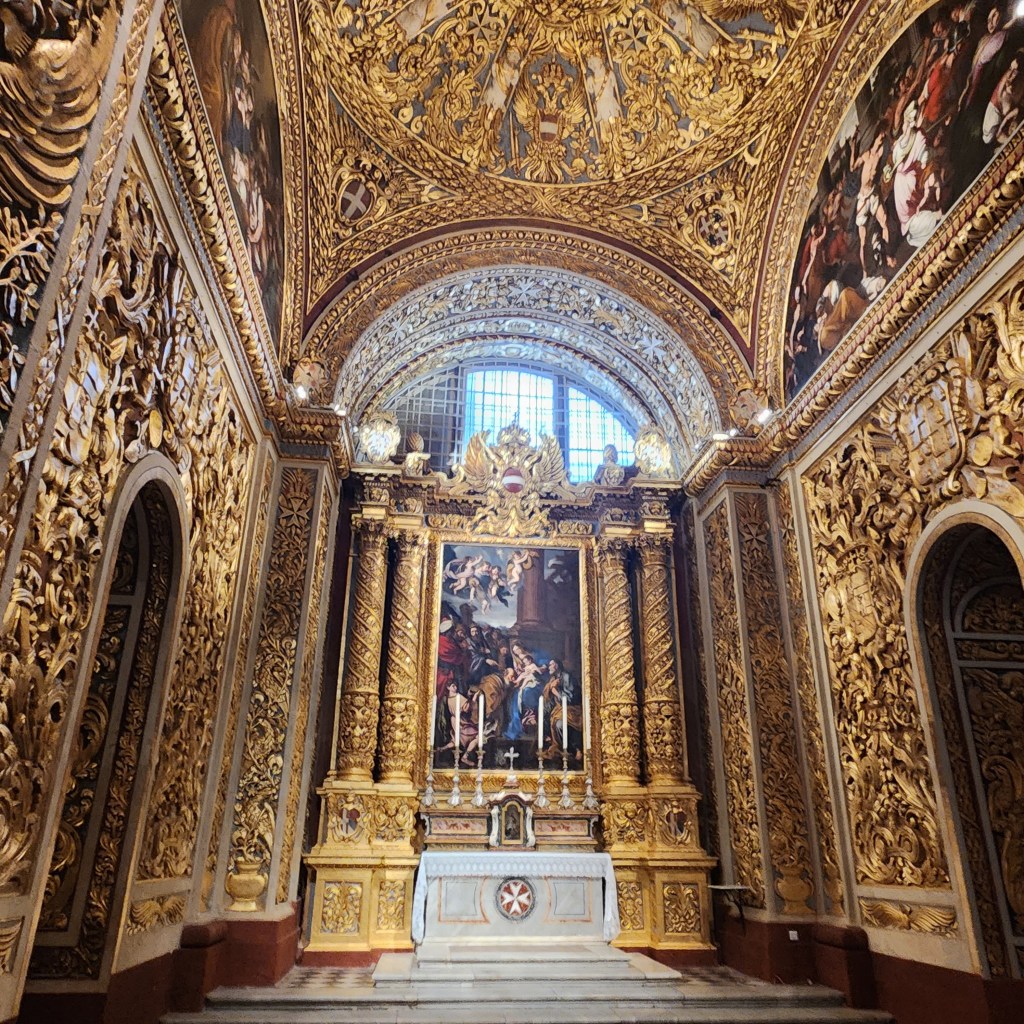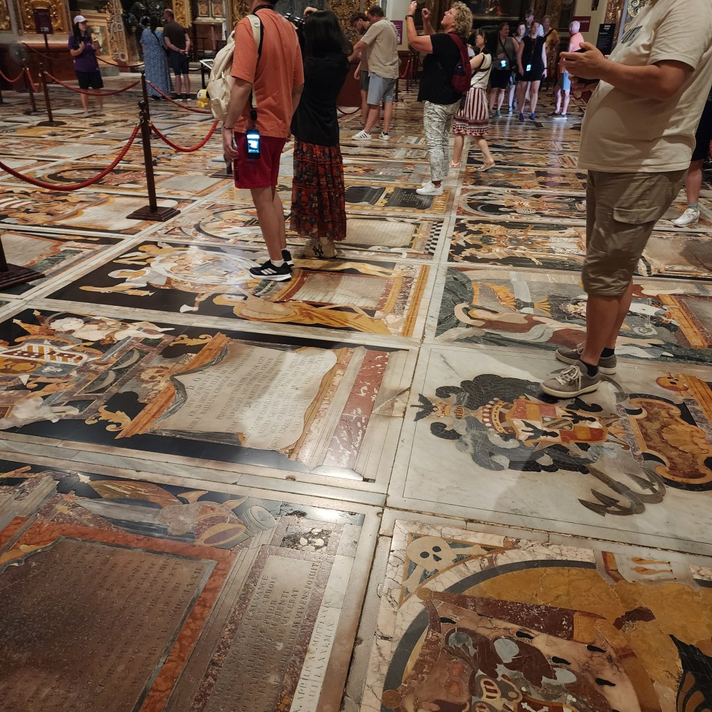 So I walked off the ship and made my way to the Barrakka Lift which was quite the walk. I stopped along the way an asked a “hop-on hop-off” bus tour if they had English guides and they said no so I kept walking. The Barrakka Lift brings you from sea level to the main level of the town of Valetta. Nice wide streets, cool shops, so crowded. I toured St. John’s CO-Cathedral (the CO part indicating it shares the bishops seat with another church). It was the most Baroque church I have ever seen. Not an inch of space left undecorated!!