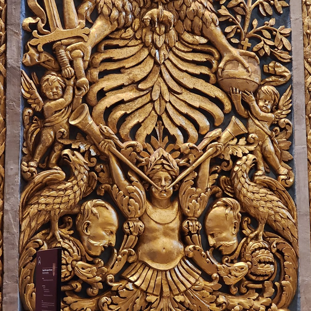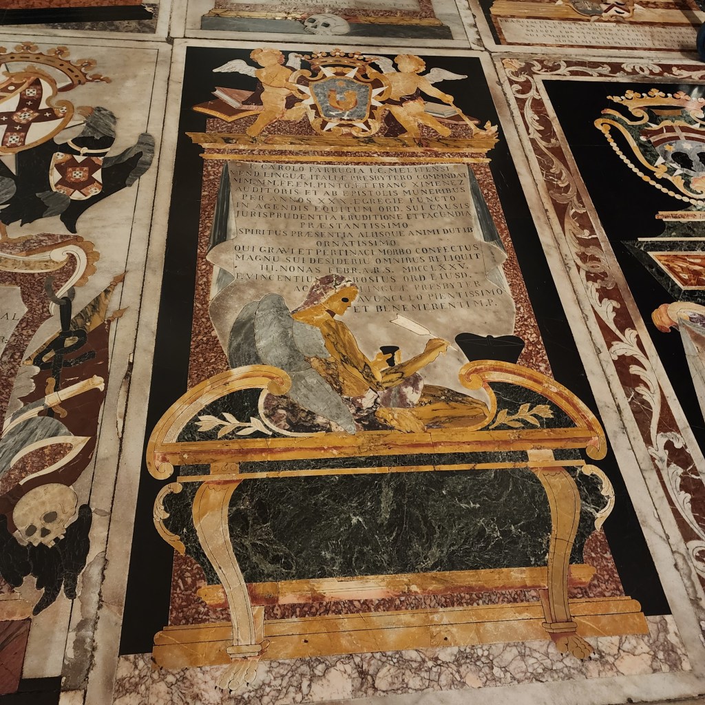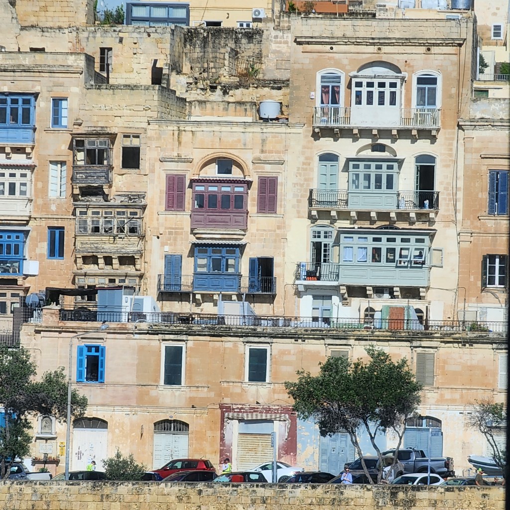 So I walked off the ship and made my way to the Barrakka Lift which was quite the walk. I stopped along the way an asked a “hop-on hop-off” bus tour if they had English guides and they said no so I kept walking. The Barrakka Lift brings you from sea level to the main level of the town of Valetta. Nice wide streets, cool shops, so crowded. I toured St. John’s CO-Cathedral (the CO part indicating it shares the bishops seat with another church). It was the most Baroque church I have ever seen. Not an inch of space left undecorated!!